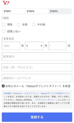 最後に性別・生年月日・郵便番号・名前・連絡用メールアドレスを入力し登録しするを押します。